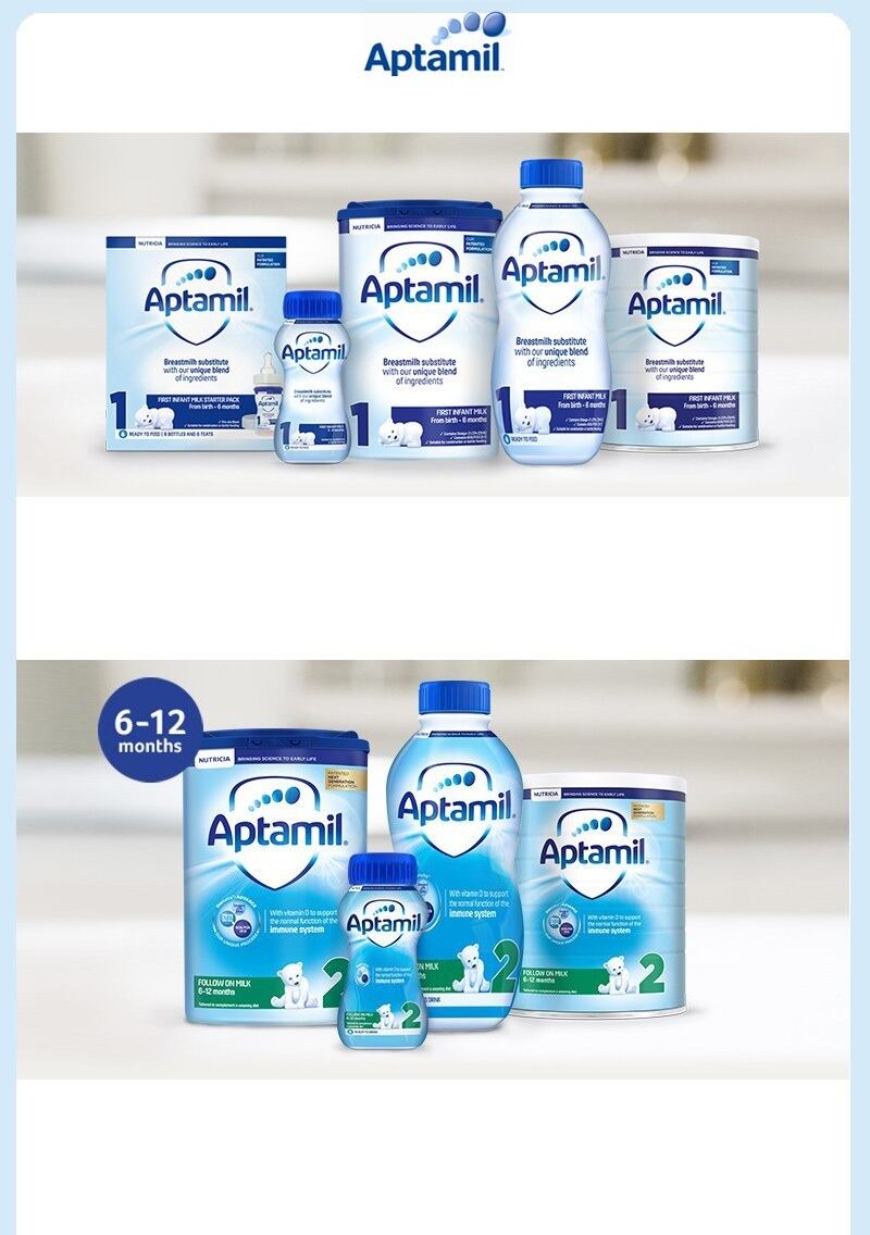Aptamil (アプタミル) はヨーロッパ・アジアNo.1 母乳に一番近いベビーミルクで、50年の歴史を持ち、日本より厳しいヨーロッパの食品安全基準適合しています。アプタミルは誕生から卒乳まで使うことができ、母乳や他のアプタミルと混合使用できます。