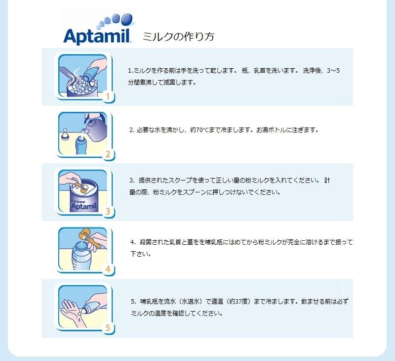 Aptamil (アプタミル) はヨーロッパ・アジアNo.1 母乳に一番近いベビーミルクで、50年の歴史を持ち、日本より厳しいヨーロッパの食品安全基準適合しています。アプタミルは誕生から卒乳まで使うことができ、母乳や他のアプタミルと混合使用できます。